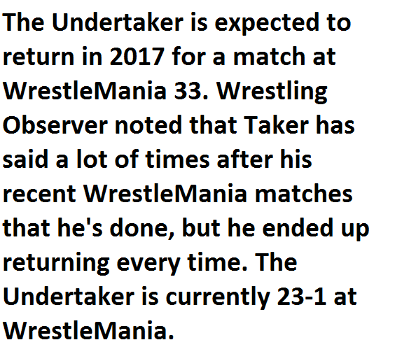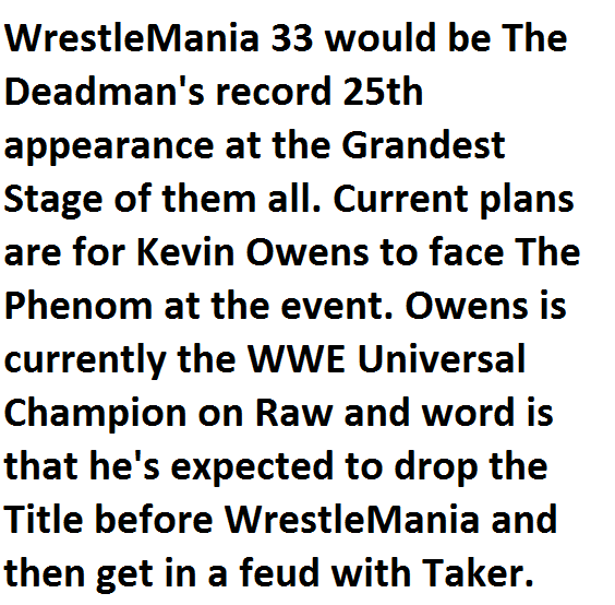 News & Stories5 Matches That Are Expected To Happen At WrestleMania 33 By AG Posted on October 13, 2016 Share Tweet Share Share Email Comments2. The Undertaker vs. Kevin Owens 1 2 3 4 5 6 Continue reading.. Next Story >