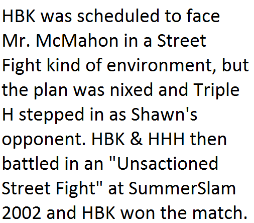 News & StoriesPlans That Got Cancelled In WWF/WWE History – Episode 1 By AG Posted on October 24, 2016 Share Tweet Share Share Email Comments4. Shawn Michaels vs Mr. McMahon – SummerSlam 2002When Shawn Michaels planned to come out of retirement in 2002, there were plans for him to face Mr. McMahon in one final match in the summer of that year. 1 2 3 4 5 6 7 8 Continue reading.. Next Story >