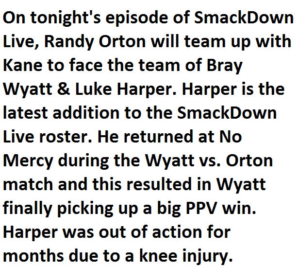 Tonight’s episode of SmackDown Live will feature the aftermath from No Mercy 2016 (where AJ Styles retained the WWE World Title and Dolph Ziggler won the Intercontinental Title).