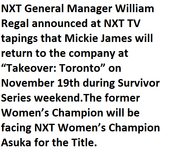 [/showhide]Mickie James vs Asuka at Takeover: Toronto! pic.twitter.com/zL8YwmaffC