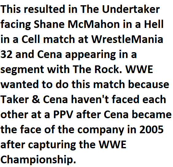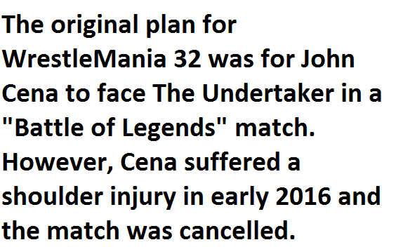 News & StoriesOld School WWF Manager Passes Away, Record Setting WWE Title Reign Cancelled, 3 WrestleMania Matches Got Cancelled Due To Injury By AG Posted on October 21, 2016 Share Tweet Share Share Email Comments– John Cena vs. The Undertaker – WrestleMania 32 1 2 3 4 5 6 7 8 Continue reading.. Next Story >