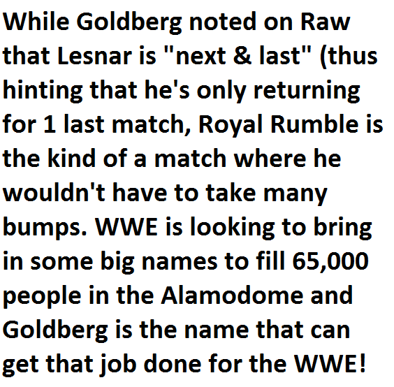 News & StoriesPossible Surprise Entrants In The Royal Rumble 2017 Match By AG Posted on October 20, 2016 Share Tweet Share Share Email Comments6. GoldbergGoldberg made his return to WWE programming after 12 years and got a huge ovation from the crowd. He accepted Brock Lesnar’s challenge for a match and that match is expected to take place at Survivor Series 2016. 1 2 3 4 5 6 7 8 Continue reading.. Next Story >