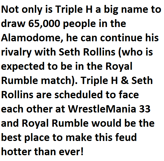 News & StoriesPossible Surprise Entrants In The Royal Rumble 2017 Match By AG Posted on October 20, 2016 Share Tweet Share Share Email Comments5. Triple HTriple H was the winner of the last Royal Rumble match (in which he won his 14th World Title) and became the 2nd man to win the Royal Rumble match from #30 spot. 1 2 3 4 5 6 7 8 Continue reading.. Next Story >