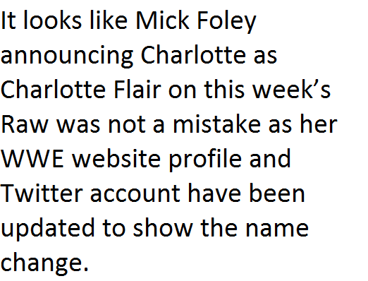 As seen on this week’s episode of Monday Night Raw, Raw General Manager Mick Foley introduced former Raw Women’s Champion Charlotte as “Charlotte Flair”.