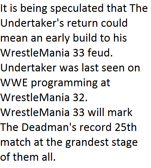 News & StoriesThe Undertaker’s Return Date Revealed, Top SmackDown Star Pulled From Survivor Series 2016, Reason Behind Sasha Banks Losing The Raw Women’s Title At Hell In A Cell 2016, On This Day In Pro Wrestling History – November 2, 1998 By AG Posted on November 3, 2016 Share Tweet Share Share Email Comments3. The Undertaker’s Return Date RevealedIt looks like The Undertaker will return to WWE programming before his 26th WWE anniversary. 1 2 3 4 5 6 7 8 Continue reading.. Next Story >